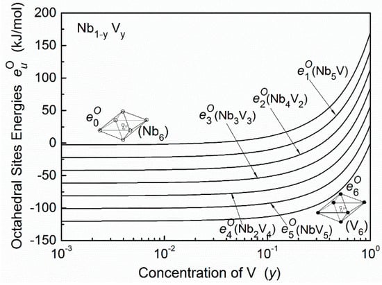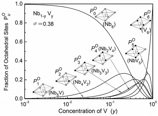 where PA or PB is the probability of the lattice atom A or B, PAA(B) is the probability of finding an A (or B) atom as nearest neighbor of another A atom, is the probability of the tetrahedral site [5]. The calculation results of seven octahedral interstices in Nb1−yVy system are shown in Figure 3. Here the local order parameter (σ) was chosen as 0.38 since this value was determined at a range of 0.33–0.44 by the enthalpy of solution data [19].