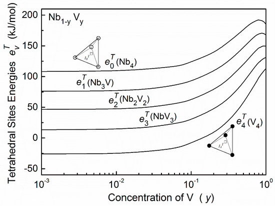 The site energy can also be calculated by the embedded-cell method [4]. Here, the embedded cells are tetrahedrons, i.e., A4−vBv (v = 0, 1, …, 4). The calculated results of tetrahedral site energies in the Nb–V–O alloys are shown in Figure 5.