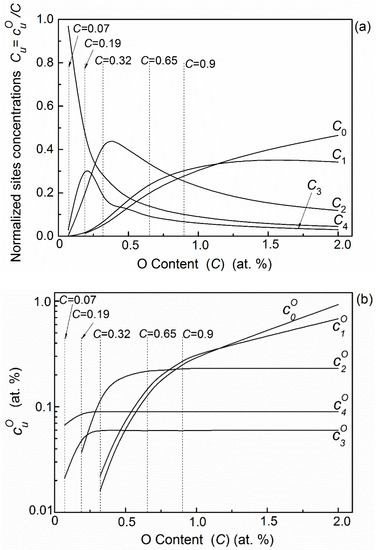 The distribution of oxygen atoms in Nb–0.5V (at. %) alloys with different oxygen content (): (a) normalized distributions Cu (); (b) absolute distribution .
