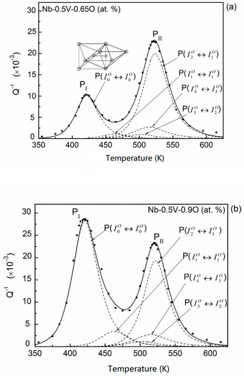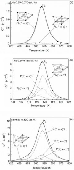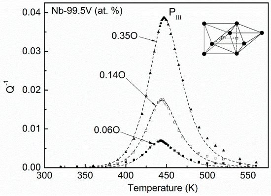 In Nb–0.5V–0.32O (at. %) alloys, the concentrations of oxygen atoms in the sites of and , i.e., and , become saturated, and more than 40% of oxygen atoms distribute in the site of . Additionally, the occupancies of the higher-energy site become appreciable and the corresponding transition may also contribute to the whole relaxation performance. This additional process will further increase the width of whole relaxation peak (PII) in this system. The fitting result is shown in Figure 7c.