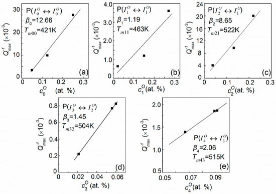 The heights of all fitted elementary peaks (Qu−1m) for Nb–0.5V (at. %) alloys as a function of oxygen site concentration () are plotted in Figure 9. It can be seen that, basically, a good linear relation exists between Qu−1m and , i.e., Qu−1m = β. This is also a characteristic of the standard Snoek-type relaxation process [1]. Using these linear relations and the distributions of the oxygen solutes, as shown in Figure 6, the temperature-dependence relaxation curve for Nb–0.5V systems with any oxygen concentration can be determined in principle. As a matter of example, the calculated curve for Nb–0.5V–0.45O (at. %) is shown in Figure 10. It can be seen that, although < 1 in this system, a notable peak PI also can be predicted, rather than what Carlson et al. proposed. Such a characteristic mainly results from the appreciable distribution (about 10.94% as shown in Figure 7a) of oxygen atoms in the interstitial sites of .