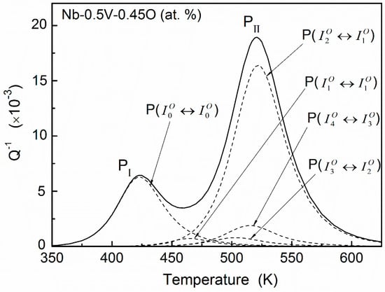As shown in Figure 6, with the increase in oxygen concentration, the occupying of energy-favorable sites such as , , and will reach the saturated capacities. These situations are fully exhibited in the case of the Nb–0.5V–0.65O (at. %) system. In addition, about 23.6% and 19.8% of oxygen atoms distribute in the sites of and , respectively. Almost all transitions of oxygen interstitial atoms in site occur in the process of since the transition probability of is equal to 0.99. This process is the so-called normal oxygen Snoek relaxation in unalloyed Nb, which has been reported elsewhere at about 420 K (at frequency 1 Hz). Thus, a second peak (PI) at about 400 K was observed in the experimental curve. The fitting results are plotted in Figure 8a. It can be seen that the experimental peak PI mainly resulted from the elementary relaxation process . The height of fitted elementary peaks P() and P() in this alloy are nearly equal to the case of the Nb–0.5V–0.32O alloy for the same distributions of and in both systems.