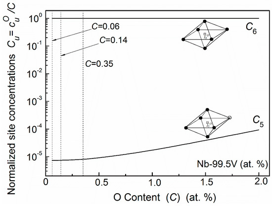 Then, by using Equations (1)–(3), the distribution of oxygen interstitial atoms in the Nb–V–O system can be determined under any thermal equilibrium conditions.