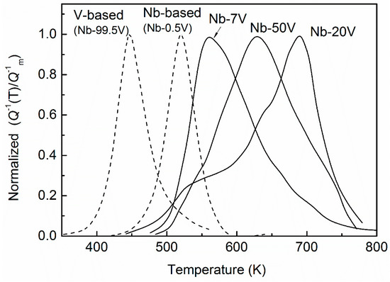 Normalized relaxation peaks for concentrated substitutional solute Nb–V alloys with 7, 20, and 50 at. % V. Comparison with the peaks for Nb-based (Nb–0.5V (at. %)) and V-based (Nb–99.5V (at. %)) systems.