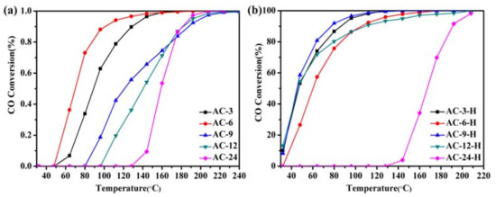 The activities of catalysts in CO oxidation were carried out in a fixed-bed quartz reactor with a length of 240 mm and a diameter of 8 mm. The catalyst weight was 50 mg, sieved into 40–80 mesh and the catalyst was not diluted in any diluent. A feed gas (0.2% CO in N2 + 5% O2 in He) was introduced into the catalyst equipment at the total flow rate of 100 mL/min, resulting in a space velocity (SV) of 120,000 mL·gcat−1·h−1. Then, the samples were heated from 30 °C at the rate of 4°/min. The products were detected with an online gas chromatograph (GC-2080, Ruipeng Chemical Instrument Corporation, Tengzhou, China) equipped with a thermal conductivity detector (TCD). The stability tests were measured with the same reactor and the same feed gas at 100 °C.