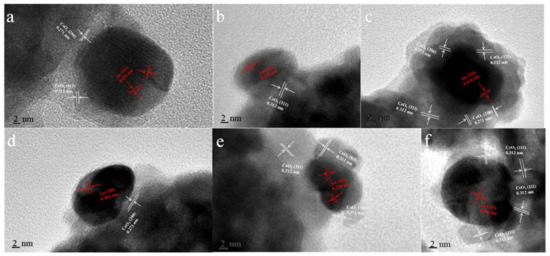 As can be seen in Figure 5, the typical HRTEM micrographs of the single Au-CeO2 nanosphere reveal the presence of Au particles, in contact with the CeO2 surfaces. The fringe period of ~0.312 nm and ~0.271 nm is respectively in agreement with the (111) and (200) lattice spacing of CeO2, the lattice fringes of ~0.236 nm and ~0.204 nm are consistent with the (111) and (200) crystal plane of metallic Au. As shown in Figure 5a, Au NPs on the AC-3 sample without H2 pretreatment were naked. After H2 pretreatment, several important characters can be distinguished for the different samples in Figure 5b–f: (i) the naked and covered Au NPs coexist for AC-3-H, AC-9-H, AC-12-H and AC-24-H samples; (ii) whereas for AC-6-H sample, the coverage increased rapidly and the Au NPs are almost completely covered. Interestingly, AC-6-H is the only sample with Au NPs completely covered, which may be due to the increase of Au NPs and CeO2 crystallite size with the prolonged calcination time and/or the reduction of H2 pretreatment. The coverage of oxides support on metal NPs is a typical feature of SMSI phenomenon [13]. As a result, the coverage of CeO2 support on the Au NPs indicates the formation of SMSI in our Au-CeO2 catalysts with H2 pretreatments.