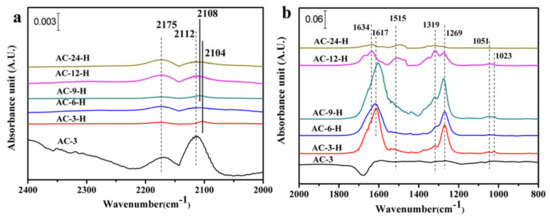 For the Au-CeO2 samples with H2 pretreatments, the band intensity of these carbonate species decreases in the order: AC-9-H > AC-3-H > AC-6-H > AC-12-H > AC-24-H. Among all samples with H2 pretreatments, AC-9-H and AC-3-H samples exhibit relatively larger band intensity of carbonate species, which may be ascribed to their higher surface areas compared with other samples. Significantly, bicarbonate species have been detected for all samples and account for the vast majority of these carbonates species. Moreover, when the calcination time increased to 24 h, the peak intensity of the bicarbonates species decreased sharply. It is well known [18,23] that the surface bicarbonates are less thermally stable than carbonates species, which facilitates faster desorption of CO2, allowing the surface effective for further chemisorption. Therefore, the presence of bicarbonates on the Au-CeO2 under H2 pretreatments can accelerate CO oxidation.