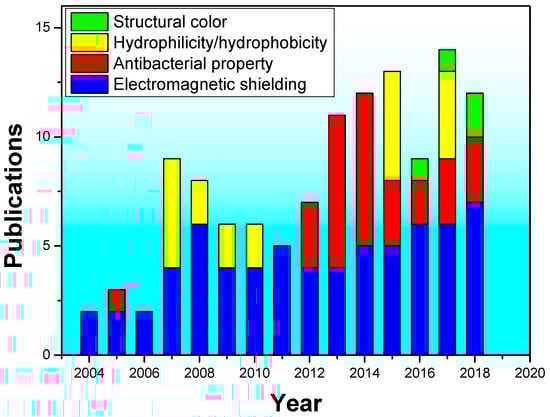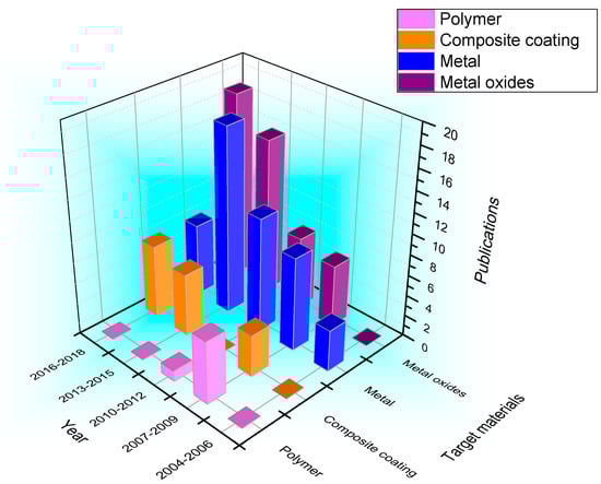 The number of references related to the functionality and target materials of magnetron sputtering coated fabrics in the last 15 years are illustrated in Figure 1 and Figure 2, respectively (the year of 2018 is from January to July). In Figure 1, it can be found that the number of literatures on magnetron sputtering coated fabrics from 2004 to 2018 increased year by year. Among them, the research on preparation of electromagnetic shielding fabrics is most extensive, and a certain number of research papers are published every year. However, papers on hydrophilic and hydrophobic-coated fabrics have been published on and off since 2007. The application to prepare antibacterial fabrics has been a continuing research content since 2012. The research papers of structural color of coated fabrics have only been published in the last three years because of the characteristics of saving water resources and environmental protection. It is also an important trend in the field of textile printing and dyeing research in the future. In Figure 2, it can be found that the commonly used target materials on magnetron sputtering coated fabrics were metals, metal oxides, polymer materials and composite coatings from 2004 to 2018. The research on polymer materials as target materials has been mainly focused on 2007–2009, the polymer target materials are commonly used for hydrophobic finishing and the amount of literatures is small. The application of metal target materials to obtain electrical conductivity, shielding efficiency had gradually increased in 2004–2015, but decreased from 2016. However, the metal oxides as target materials have been researched increasingly. In addition, it is necessary to pay attention to the increasing trend of composite sputtering using various target materials. Although the number of studies is not much, this method can combine the advantages of various target materials to impart fabrics multiple functions at the same time. So, it is a possible research focus for the future.