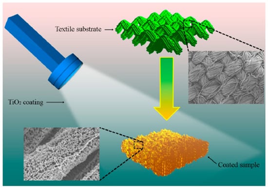 When polyacrylonitrile (PAN) and polyurethane (PU) composite materials (mass ratio of PAN/PU was 8/2) substrate was deposited with Nano TiO2 film [81], it not only had excellent UV resistance (UPF value was 148.5), but also good super-hydrophobility (contact angle was 152.1°). Its super-hydrophobic property was mainly due to rough surface structure was constructed on the fibers’ surface. For example, nano TiO2 films were deposited on cotton and polyester fabrics and the TiO2 films on fabric’s surface had unique high porosity and amorphous structure [82]. Its coating scheme was shown in Figure 4. With the increasement of sputtering time, the surface tension of the coated fabric was improved. Its waterproof property was improved significantly [83].