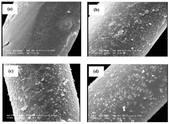 Saffari et al. [111] used low temperature plasma to pre-treat polylactic acid (PLA) fabric before depositing TiO2 film on it. With the increase of plasma treating time and sputtering time, TiO2 particles on the PLA fibers’ surface became more compact. Figure 5 shows the scanning electron microscope image of the samples. When plasma pre-treatment was 10 min, the antibacterial and photo-catalytic properties of the coated fabric was best and can endure many times washing. The initially grown TiO2 film and the chemical modification that is caused by pretreatment with oxygen plasma clearly synergistically improved film adhesion to resist washing.