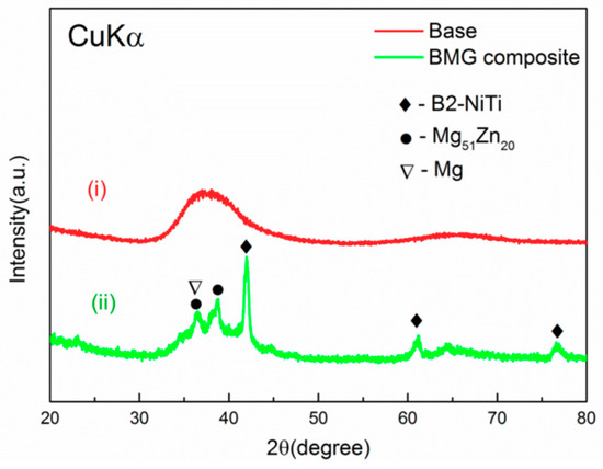 Figure 1 shows XRD patterns of base alloy (Mg67Zn29Ca4) and Mg67Zn29Ca4/NiTi BMG composite containing 3 vol. % NiTi dispersoids. As we can see, the base alloy has a broad peak of single glassy structure. Distinctive peaks from B2-NiTi phase and several weak peaks from Mg and Mg51Zn20 phases are visible in the pattern of Mg67Zn29Ca4/NiTi composite. These results indicate that the addition of 3 vol. % NiTi particles is sufficient to degrade the glass-forming ability (GFA) of Mg67Zn29Ca4, agreeing well with previous studies [16]. Apparently, the incorporation of NiTi particles into the Mg-Zn-Ca BMG was successful, just as expected.