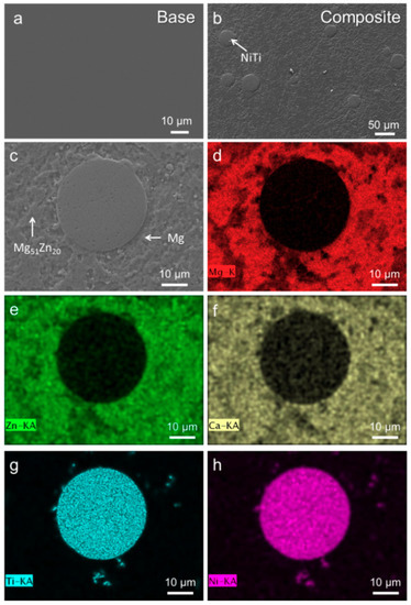 Figure 2a illustrates the microstructure of base alloy. There is no distinct crystalline contrast noticed over the entire cross-section of this sample. In the SEM images of Mg67Zn29Ca4/NiTi BMG composite in Figure 2b,c, the dispersion of NiTi particles among the matrix is clearly revealed. To further investigate the microstructure of this composite, relevant EDX element mappings were acquired, as shown in Figure 2d–h (d: Mg, e: Zn, f: Ca, g: Ti, h: Ni). Mg-rich and Mg-poor areas can be easily distinguished from these mappings, which were determined as Mg and Mg51Zn20 phases by EDX point analysis (not shown here), respectively. In addition, the porous structure of NiTi particles is also confirmed from the mapping results of Ni and Ti (Figure 2g,h). Mg, Zn and Ca from the matrix are found to permeate into the porous NiTi particles because the composition located at the particle are detected to be Ni39Ti40Mg15Zn5Ca1 (at. %), indicating a good wetting between them.
