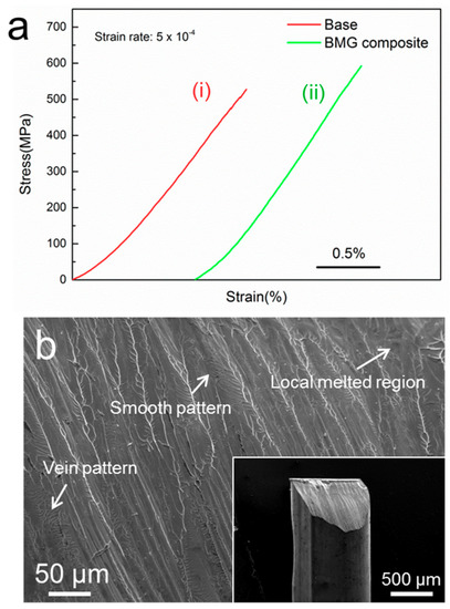 (a) Compressive stress-strain curves for (i) base and (ii) BMG composite; and (b) SEM images of fracture surfaces for the composite (image at low magnification is inserted).