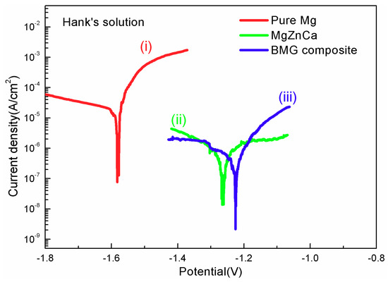 Potentiodynamic polarization curves of (i) pure magnesium; (ii) base alloy and (iii) BMG composite.