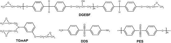 A mixture of two epoxy prepolymers was chosen: the triglycidyl meta-amino phenol (TGmAP, Araldite MY0610, from Hunstman Co., Woodlands, TX, USA) and the bisphenol-F diglycidyl ether (DGEBF, Araldite GY281, from Hunstman Co., Woodlands, TX, USA) (Figure 2). Their epoxy equivalent weights were found to be 97.7 and 170.3 g·eq−1, respectively. Triglycidyl para-amino phenol (TGpAP) and DGEBA combinations are more often reported than these prepolymers in the literature. Nevertheless, TGmAP and DGEBF present some advantages: due to the meta-configuration on the trifunctional epoxy which leads to a higher modulus for a similar glass transition temperature (Tg) than the para-configuration. The bisphenol-F based epoxy prepolymer is used since its viscosity is lower than the one of the bisphenol-A-based derivative.