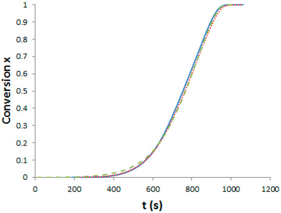 Evolution of the TS conversion versus time under non-isothermal conditions (10 °C/min). Full line: Neat system; dot line: f-PES system; dash line: nf-PES system.