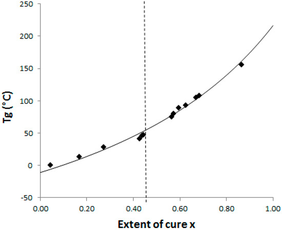 The Di Benedetto dependence is plotted for the neat system (Figure 4) from experiments done in isothermal conditions at 130 °C. In such a complex (initially off-stoichiometric and excess of epoxy) reactive system, it is quite difficult to estimate when a total conversion is achieved. After 2 h at 180 °C, the system displays some residual heat of reaction, meaning that residual epoxies can react on themselves. The Di Benedetto dependence was then built thanks to a point corresponding to a not completely built epoxy network, as done by Jordan and al.: the point (x = 1; Tg∞) is replaced by an intermediate (xmax < 1; Tgmax) [27]. For the same reasons, it was impossible to experimentally determine a value of ΔCp∞. Thus the parameter λ was determined by fitting the Di Benedetto curve to the experimental points.
