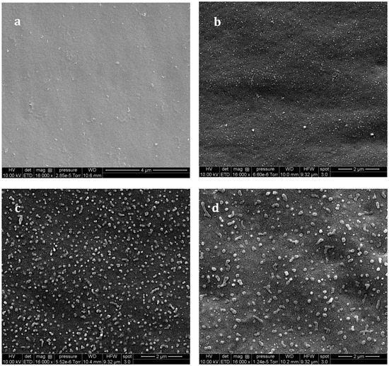SEM observations (after chemical treatment) of the f-PES modified system as a function of Tcure: 90 °C (a); 130 °C (b); 150 °C (c) and 180 °C (d).