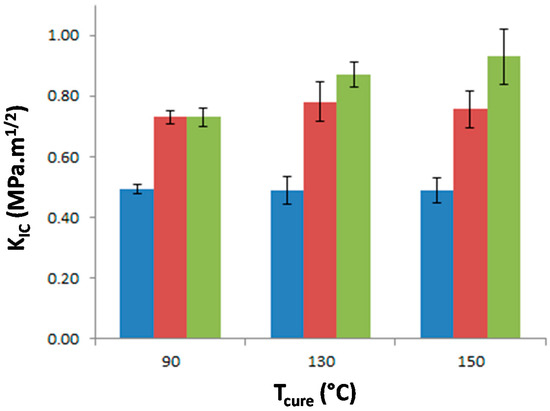 Stress intensity factor, KIC, of neat epoxy network and PES-based blends as a function of the curing temperature. Blue: neat epoxy; Red: f-PES based blend; Green: nf-PES based blend.