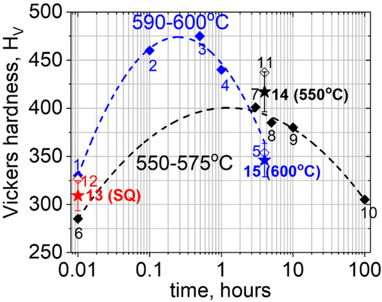 The Vickers hardness variation over time for PH-13-8Mo stainless steel as was previously reported for aging at 590–600 °C (blue points 1–4 [18]; 5: an average value from References [1,6,10,13,18,19,20,21,22] and curve) and 550–575 °C (black points 6–10 [24]; 11: an average value from References [1,6,10,13,18,19,20,21,22] and curve) as well as the variation following solution and quenching treatment (red point 12 [1,6]). The currently measured points under the investigated thermal treatment conditions are shown as the star points 11 (550 °C), 15 (600 °C), and 13 (following solution and quenching).