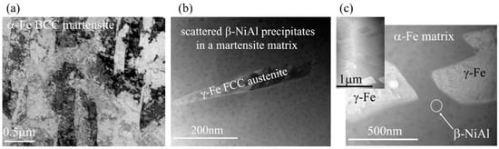 A typical microstructure following an aging treatment of 600 °C is shown in Figure 3c. This microstructure is comprised of an α-Fe martensite matrix embedded with round β-NiAl precipitates and Ni-rich reverted austenite (γ-FCC) islands. These reverted austenite islands exhibit a blocky-type morphology and are larger (~450 × 450 nm2) than the embryos obtained following aging at 550 °C (Figure 3b), in agreement with the XRD reflections analysis (Figure 2) and previous studies [18,19,23,24,25].