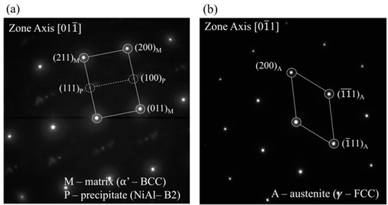 The selected area electron diffraction (SAED) patterns taken from the three phases shown in Figure 3. (a) Diffraction pattern from both the BCC α-Fe martensite matrix (M) and B2 β-NiAl precipitates (P), showing an orientation relation of [0]M||[0]P and (200)M||(100)P with a corresponding alattice = 2.898 Å. (b) Diffraction pattern taken from the FCC γ-Fe reverted austenite phase (A) with a corresponding alattice = 3.59 Å.