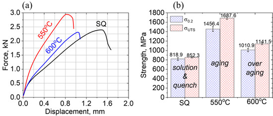 (a) The SPT load-displacement curves of the investigated PH13-8Mo samples, following solution and quenching (SQ) and aging treatments at 550 and 600 °C. (b) Yield (blue), σ0.2, and ultimate tensile (red), σUTS, stresses, as were analyzed according to the Garcia et al. [23] method, from the SPT measurement values of (a). The error bars shown in (b) are based on a standard deviation of 5 measured samples for each treatment, giving 818.9 ± 28.6, 1456.4 ± 50.9, 1010.9 ± 35.4 MPa and 852.3 ± 12.8, 1687.6 ± 25.3, 1141.5 ± 17.1 MPa, corresponding to ~±3.5% and ~±1.5%, and the measurement errors for σ0.2 and σUTS, respectively.