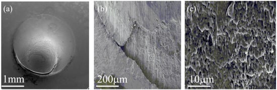 As can be seen in Figure 6a, without any hydrogen charging, the failure begins as a semi-circumferential axial crack at the bottom of the ball punched bulb-shaped indentation as is typically observed in SPT experiments, e.g., References [28,31,32,33,34]. Higher magnifications (Figure 6b,c), highlight the ductile nature of the fracture, presenting an elongated dimple surface appearance.