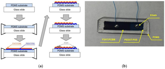 A total of six flexible strain sensors were fabricated by varying the number of PEDOT:PSS layers and pre-strain applied to the PDMS substrates (length = 75 mm and width = 12.5 mm) (Table 3). The sensor fabrication procedure (Figure 1a) began from the deposition of PEDOT:PSS conductive thin films onto the pre-strained PDMS substrate by following the same methodology described in Section 2.2.1. Once the desired number of PEDOT:PSS layers (i.e., 7 or 9 layers) were deposited onto the pre-strained PEDOT:PSS layers, a single layer of P3HT:PCBM photoactive thin films was coated onto the PEDOT:PSS layers by following same spin-coating procedure presented in Section 2.2.2. Then, one end of the coated P3HT:PCBM thin films was cleaned with DCB to expose a rectangular area (length = 20 mm and width = 12.5 mm). Then, the pre-strained PDMS substrate was released after removing the paper clips to produce the corrugated PEDOT:PSS and P3HT:PCBM thin films. One electrical connection was established on the conductive PEDOT:PSS thin films using EGaIn and 30 American wire gauge (AWG) wire. Another electrical connection was made on the P3HT:PCBM thin films using EGaIn and the 30 AWG wire. Finally, fabricated is a flexible strain sensor consisting of corrugated P3HT:PCBM and PEDOT:PSS thin films and two electrical connections.