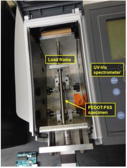 The corrugated PEDOT:PSS thin films were interrogated with an ultraviolet-visible (UV-Vis) spectrophotometer (product name: UV-1800; Shimadzu, Kyoto, Japan) to acquire optical transmittance spectrums in the wavelength range from 300 to 900 nm. Eleven different UV-Vis transmittance spectrums were acquired at eleven different tensile strain levels during loading from 0% to a maximum strain, which is identical to a pre-strain level applied for fabrication of the corrugated PEDOT:PSS thin film specimen, and unloading to 0% using a custom-built load frame (Figure 2). The specimen was stretched and released by five equal steps during loading and unloading. As a result, a total of eleven UV-Vis transmittance spectrums were produced from one specimen.