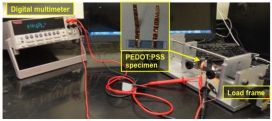 A digital multimeter (DMM; product number: Keithley 2700, Tektronix, Beaverton, OR, USA) was used to measure four-point probed resistance at various strains. Strain was applied using the custom-built load frame shown in Figure 3. Like optical transmittance characterization test, eleven strains were applied to the PEDOT:PSS thin film specimen during one cycle of loading and unloading. So, a total of 11 resistances were obtained and used for calculating sheet resistances.
