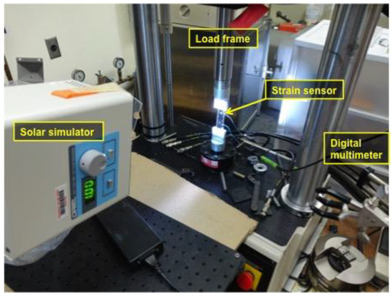 The fabricated flexible strain sensors were first subjected to quality test by measuring current-voltage (IV) responses using a source-measurement unit (SMU; product number: Keithley 2450, Tektronix, Beaverton, OR, USA) under one-sun light from a solar simulator (product name: Oriel 7320 LED solar simulator, Newport, Irvine, CA, USA) and without light. Then, qualified strain sensors were tested to validate strain sensing capability using the test setup shown in Figure 4. To apply cyclic tensile loading and unloading to the flexible strain sensor, a servo-hydraulic load frame was used. DC voltage was measured from the sensor using the digital multimeter under one-sun light from the solar simulator. The testing room was maintained as dark as possible to minimize effect by ambient light although the ambient light is thought to have minimal effect on the strain sensing of the sensor. It is because of the relatively weaker intensity of the ambient light than the one-sun light from the solar simulator.