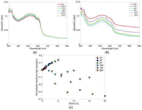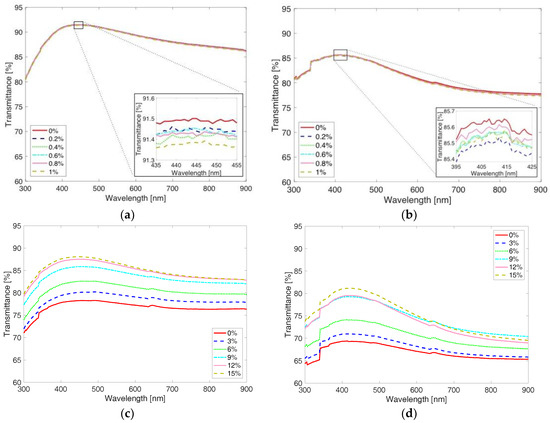 Figure 5 shows four representative sets of light transmittance spectrums that were acquired at six different tensile strains during only the loading cycle to clearly present how the transmittance changes with the applied tensile strain. It should be noted that the light transmittance during unloading exhibited similar trends with the applied tensile strain. By comparing transmittance spectrums of the 1% pre-strain specimens shown in Figure 5a,b to the 15% pre-strain specimens shown in Figure 5c,d, one can understand that overall transmittance of the specimens fabricated at 1% is higher than the transmittance of the specimens prepared at 15% pre-strain. In addition, it can be seen that overall transmittance decreases as there are a greater number of layers. Also, the overall transmittance increases as the tensile strain applied to the specimen increases, which is shown more clearly in Figure 5c,d due to larger strain applied up to 15%.
