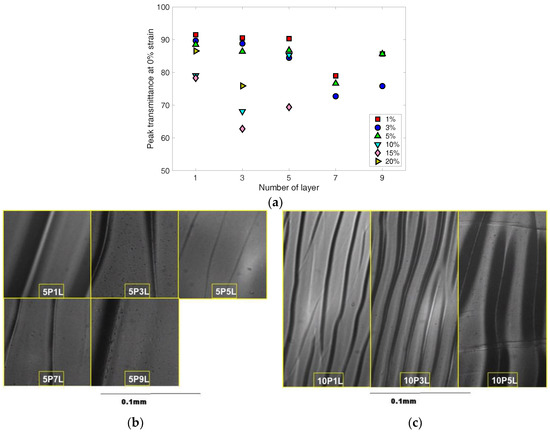 In Figure 6a, the peak transmittance at 0% strain is shown with a pre-strain, at which the corrugated PEDOT:PSS thin film specimen was fabricated. The overall peak transmittance at 0% strain decreases as the pre-strain increases up to 15%. It increases again as the pre-strain increases from 15% to 20%. The specimens with 7 and 9 layers of PEDOT:PSS thin films exhibit different characteristics from the other specimens with a less number of layers (i.e., 1, 3, and 5 layers). For specimens with a large number of layers (i.e., 7 and 9 layers), peak transmittance decreases with the pre-strain increasing from 1% to 3% but increases again with the pre-strain increasing from 3% to 5% strain. The decreasing transmittance trend with increasing pre-strain from a specimen seems to be mainly due to wrinkles formed in the corrugated thin films.