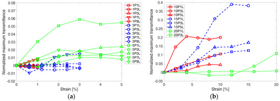 Normalized maximum transmittance change is shown with applied strain for the corrugated PEDOT:PSS thin film specimens, which were fabricated at (a) low pre-strain up to 5% and (b) high pre-strain up to 20%.