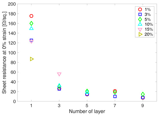 Sheet resistance of the corrugated PEDOT:PSS thin film shows a strong relationship with the number of PEDOT:PSS layers (Figure 9). Similar to the sheet resistance of the inkjet-printed PEDOT:PSS thin films reported in [22], sheet resistance of the corrugated PEDOT:PSS thin films exhibited an exponential decrease with the increasing number of layers. In particular, the corrugated PEDOT:PSS thin films with 5 or more layers showed sheet resistance below ~20 Ω/sq. In particular, there was negligible effect by the pre-strain for the thin films with 5 or more layers while the specimens with less than 5 layers were affected by the pre-strain. It is because the wrinkle profiles of the corrugated PEDOT:PSS thin film specimens with less than 5 layers change more drastically with the pre-strain due to the smaller critical buckling strain than the PEDOT:PSS thin film specimens with 5 or more layers. Sheet resistance of the corrugated PEDOT:PSS thin film specimens with 1 layer exhibit the largest decrease with increasing pre-strain. This is due to a larger discrepancy between lengths based on the direct distance and the actual, which is contoured along the wrinkled thin films, length between the electrodes of the PEDOT:PSS thin film specimens as pre-strain increases. It should be noted that the corrugated thin film’s actual length (i.e., contoured) is longer than the length directly measured between two points (i.e., two electrodes). Sheet resistance was calculated with the shortest length between electrodes, instead of the contoured length. The higher pre-strain thin films tend to have more wrinkles and thus larger difference between the shortest length, which was used for the calculation of sheet resistance, and the contoured length. The length difference resulted in the decrease in sheet resistance of the 1 layer specimen with increasing pre-strain.