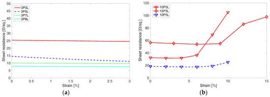 Effect of applied tensile strain on the sheet resistance is shown for (a) the 3% pre-strain specimen and (b) high pre-strain specimens fabricated at 10% and 15% pre-strain.