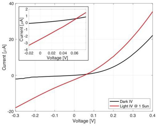 Current-voltage response of FS-1P7L specimen is shown under one-sun light and without light. The inset provides a clear view of the short circuit current and open circuit voltage from the vertical axis intercept and the horizontal axis intercept.