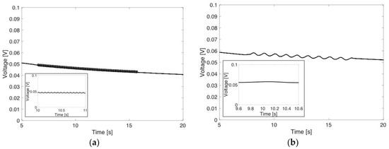 Figure 13 shows DC voltage response generated from the FS-1P7L flexible strain sensor in time domain when the strain sensor was subjected to sinusoidal tensile strain loading and unloading cycles. As the loading frequency increases from 1 Hz to 15 Hz while maintaining minimum and maximum tensile strains of 0% and 1%, respectively, cycles of the generated DC voltage also shift in frequency from 1 Hz to 15 Hz. DC voltage generated from the 1% pre-strain sensors (i.e., FS-1P7L and FS-1P9L) responds very well to the applied sinusoidal tensile strain loading and unloading cycles. The other four sensors, which were fabricated at higher pre-strains, produced a DC voltage sensor signal with lower signal-to-noise ratio than the 1% pre-strain sensors. It is thought to be mainly due to a disturbance in liquid EGaIn electrodes due to the higher strain applied.