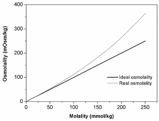 in which γ2 is HPβCD activity coefficient; m is molality of HPβCD solution; and ϕ is osmotic coefficient, which was obtained as proportional coefficient between osmolality () and molality (assuming that HPβCD does not dissociate in water, n = 1):