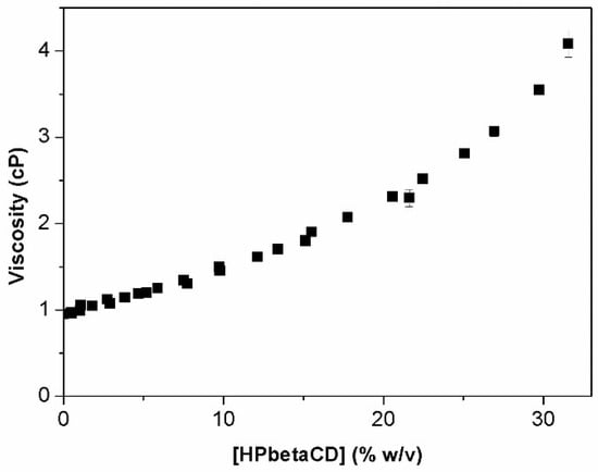 Figure 3 illustrates of HPβCD viscosity behavior with increasing concentration. A linear increase of viscosity is observed at HPβCD concentration below 11% (w/v), after which a positive deviation from linearity is observed. This upward curvature at higher HPβCD concentrations is not a novel observation, and similar results have also been described before [13,24,25,26,27].