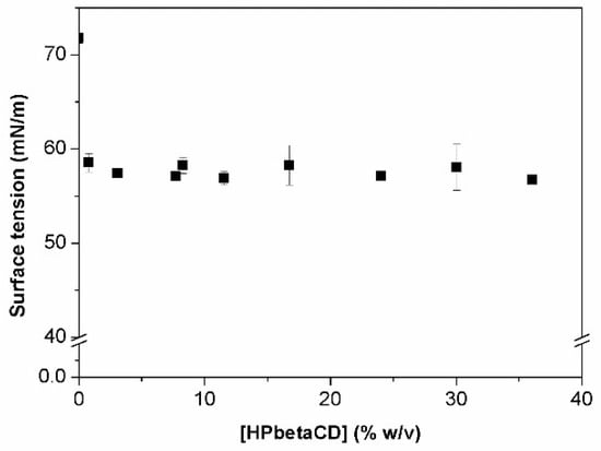A decrease of 14 mN/m was observed at 0.5% (w/v) HPβCD concentration (corresponding to CMC), after which constant values are obtained even at HPβCD concentration as high as 35% (w/v). Yoshida et al. suggested that this decrease in surface tension is due to the surface activity of HPβCD [24,30]. Other substituted βCDs also possess surface activity greater than that of the natural βCD [13,26,31]. The stronger interaction of hydroxypropyl groups with water molecules is probably responsible for the disruption of the water network at the surface. HPβCD results in positive deviation from linearity of the activity coefficient, indicating that solute–solvent interactions are preferred over solute–solute interactions. This can explain why HPβCD promotes a slight change in surface tension. However, here the focus is on the detection of CD aggregates and how these structures could influence or modify the surface tension of a solution when HPβCD is present.