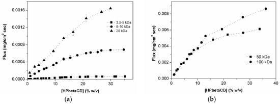Flux profile of HPβCD through semipermeable membranes: 3.5–5, 8–10, and 20 kDa (a) and 50, 100 kDa (b) at room temperature (about 23 °C).