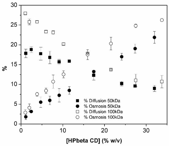 % osmosis (circles) and % diffusion (squares) determined for aqueous HPβCD solutions when studies used different MWCO semipermeable membranes: 50 kDa (black) and 100 kDa (white) (n = 3).