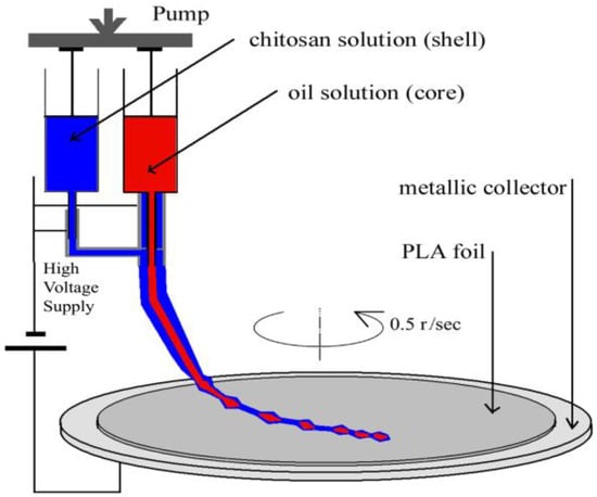 After plasma treatment, the coaxial electrospinning was applied to obtain oil-loaded nanostructures, by encapsulating the clove or argan oil into the chitosan nanostructures, simultaneous with being coated onto the plasma-treated PLA substrates. The coaxial system consisted of chitosan supplied to the outer nozzle and oil solutions supplied to the inner nozzle.