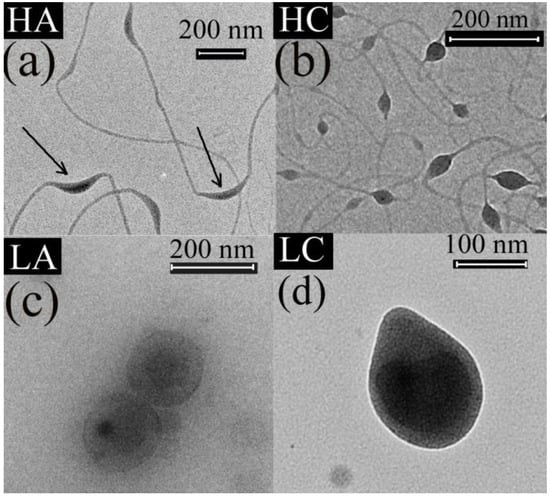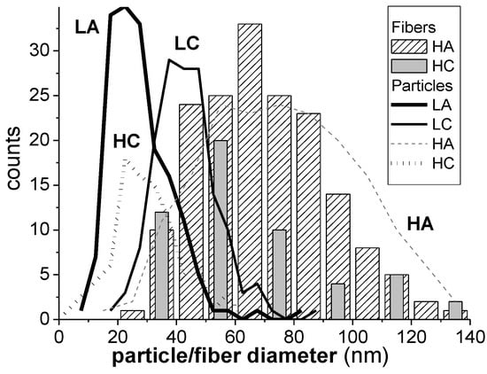 The TEM images show a hybrid fiber and particle morphology for the HA and HC samples (Figure 2a,b), and particle morphology for the LA and LC samples (Figure 2c,d).