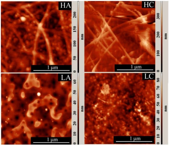 It is interesting to compare the width (range) of the particle and fiber diameter distributions, determined from the AFM images, with the width of the AFM height distribution (Table 2, Figure 4 and Figure 5). The width of the AFM height distribution was similar to the width of the particle AFM diameter distributions for the LA and LC samples, but was much wider than the particle and fiber diameter distributions for the HA and HC samples.