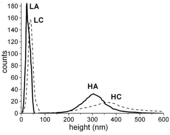 This is because, compared with the HA and HC samples, the LA and LC samples had a more compact particle arrangement, with smaller voids between them, which narrowed the height distribution. This was also shown by other authors [44,45], who correlated the roughness (or the width of the height distribution) of nanoparticle layers with the experimentally measured nanoparticle sizes, and also with the way the particles are packed [44]. For a closely (or orderly) packed spherical structure, with spheres tangent to one another (particle-near-particle), the roughness is low and the AFM height distribution approaches the particle diameter distribution (roughness approaches the average diameter of the particles). But when the same particles are randomly packed in a more porous arrangement, the roughness increases [45]. Thus, it can be concluded that, for the LA and LC samples, the structures were more compact with lower porosity (smaller voids between particles) and, consequently, with narrower height distribution than the HA and HC samples.