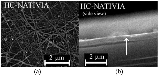 Scanning electron microscopy (SEM) images of the HC-NATIVIA sample: (a) Morphology of the coated surface; and (b) side view showing the coated layer.