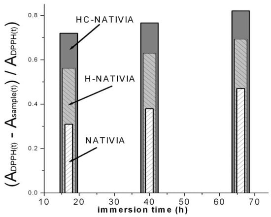 In a second test, the sample with higher antioxidant activity (HC-NATIVIA) was chosen to measure the antioxidant activity over the immersion time. Before testing, the samples were stored for seven days at room temperature, in order to check the encapsulation and persistency of the volatile clove oil in the samples. The results were compared with the corresponding uncoated (NATIVIA) and chitosan coated film (H-NATIVIA). In this second test, a higher film area (4 cm2) was cut and immersed into the same amount of radical solution with the same concentration. It can be observed that all the three samples had antioxidant activity (Figure 7) that was maintained over a fairly long time (tens of immersion hours) as a result of the clove oil encapsulation into the chitosan fibers. The concentration of biphenyl radicals continued to decrease (RSA increased) in the solution containing the immersed film relative to the control sample, even after 70 h of immersion. The antioxidant activity of the uncoated NATIVIA, which was lowest among the tested samples, was due to the residual lactic acid in the films.